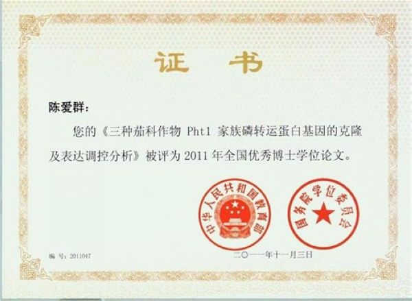 陈爱群的博士论文(指导教师:徐国华教授)《三种茄科作物pht1家族磷转运蛋白基因的克隆及表达调控分析》获2011年全国优秀博士学位论文