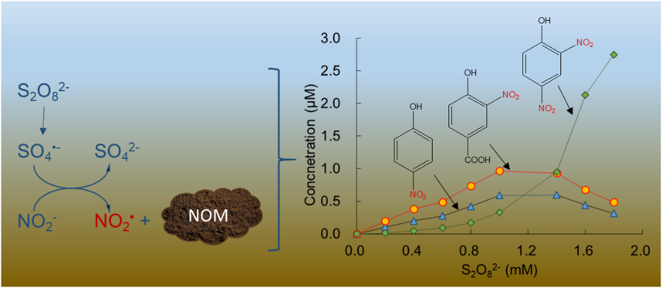 基于SO4•-的高级氧化工艺是污染控制领域的一个热点课题,尤其在土壤和地下水修复方面的应用,国内外已有大量的报道,然而对于这一技术可能存在的问题和局限则很少关注。该论文在模拟地下水环境条件下,系统研究了NO2-硫酸根自由基氧化过程中的转化和归趋。通过15N同位素标记,结合质谱(MS)、傅里叶红外(FTIR)和核磁共振(15N-NMR)分析,发现NO2-可转化为有机硝基副产物,如对硝基酚、4-羟基-3-硝基苯甲酸、2,4-二硝基酚等。在此过程中,SO4•-起了关键作用,它将NO2-氧化生成二氧化氮自由基(NO2•),后者是一种活泼的硝化剂,主要和天然有机质(NOM)大分子中的酚结构单元反应,通过夺氢-加成途径,转化为硝基副产物。