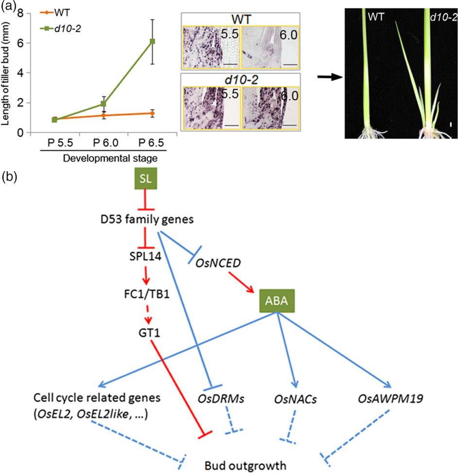 本研究以日本晴水稻作为研究的主体,独角金内酯合成突变体材料d10作为参照,建立了水稻水培体系,观察腋芽生长的临界点,通过原位杂交分析表明,叶片细胞分裂停止后,分蘖芽的原基进入休眠。由激光显微切割捕获进入休眠状态前后的分蘖芽并且进行转录分析得到差异表达基因。发现细胞周期基因和核糖体基因包括在活性芽表达的基因中,而脱落酸(ABA)相关基因属于休眠相关基因。通过水培实验进一步验证ABA可以将SL突变体的腋芽生长抑制到与野生型(WT)相同的水平。同时,编码ABA生物合成的基因OsNCED1过度表达的转基因株中,分蘖数降低。这些结果表明,SL功能的主要部位是腋芽中的叶原基,ABA参与了SL介导的腋芽休眠。