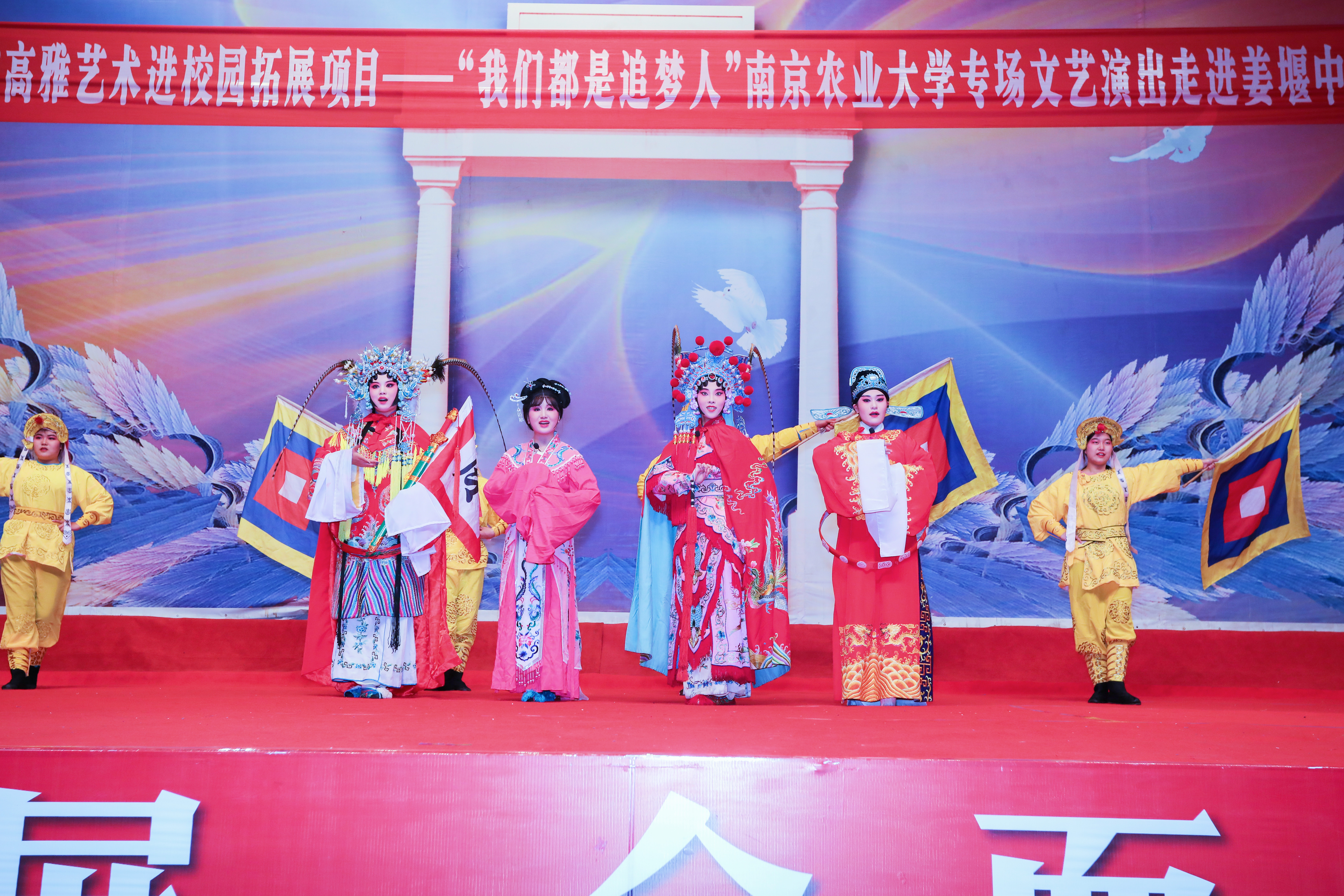 大学生艺术团演出的原创舞蹈《红》、朗诵《荣光岁月》、戏曲联唱《戏曲中国》、器乐表演《后浪狂想曲》、音诗画《今天,我们这样爱国》等节目,通过多种艺术形式将红色经典、传统文化带进姜堰中学,为师生们上了一趟生动的美育素养课。
