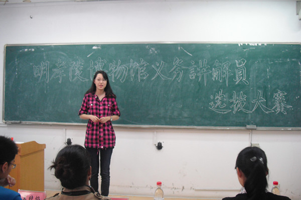 学生会青年志愿者协会举办的明孝陵义务讲解员选拔大赛在教学楼B201和B205同时进行。担任本次比赛评委的是:明孝陵博物馆宣教部主任臧卓美,副主任蔡涛,av直播