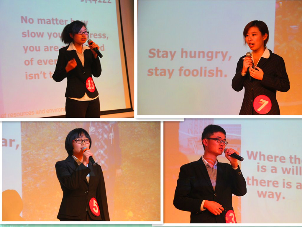 本次演讲比赛分四个环节,分别是选手自我介绍、主题演讲、随机抽题以及评委问答。14位经初赛选拔出来的同学在一番流利的自我介绍后,分别就“opportunities and challenges”为主题展开一番演讲。其中,五号选手王丽红,凭借自己出色的临场发挥以及从容的场面作答,赢来在场观众的几片喝彩。