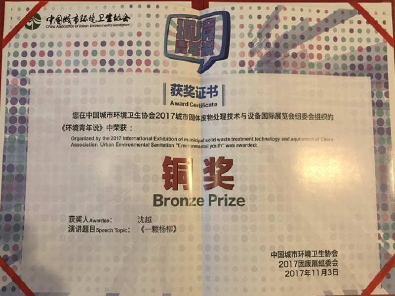 葛滢教授指导的微生物方面研究项目的启发,以《一棵杨柳》为演讲主题,表达了改变人类和动物尸体埋葬方式的观点。沈越说:“作为一名致力于环境保护的新青年,在环境卫生这一领域,我们这一代所追求的更多应该是环境保护的新思想和新领域,而非传统的固有观念”。沈越的演讲主题引起了专家评委们的广泛讨论,她的演讲风格和现场表达受到了专家评委的一致好评。最终,沈越同学荣获大赛铜奖。