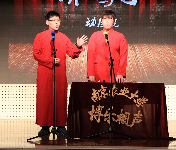 的两位同学带来的相声表演《养鸽子》,以幽默风趣的语言引得全场阵阵笑声。