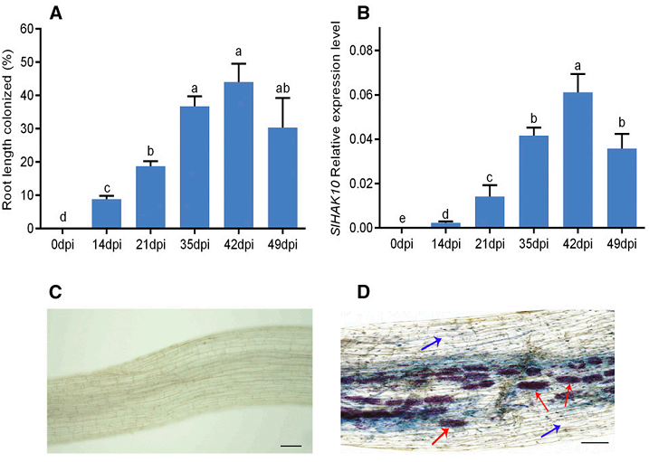 以前对菌根共生与养分互作效应的研究主要集中在磷素营养,而对菌根共生介导的其它养分吸收机制的研究还非常欠缺。近日,av直播 徐国华教授团队在Plant Physiology在线发表了题为The Potassium Transporter SlHAK10 Is Involved in Mycorrhizal Potassium Uptake”的研究论文。该研究证明了接种AM真菌Rhizophagus irregularis能够显著提高番茄体内钾含量,而低钾胁迫对番茄菌根共生具有负效应。该团队通过转录组数据库分析,从番茄中鉴定到唯一一个受菌根共生诱导的钾转运体基因SlHAK10。该基因在被菌丝侵染形成丛枝的细胞中特异表达。突变该基因显著降低菌根途径钾吸收,并在低钾胁迫条件下抑制可溶性糖在根中积累,从而不利于菌根共生。将SlHAK10在番茄中超表达能够显著增强低钾胁迫条件下植株对钾的吸收能力,并提高根系可溶性糖含量,提高菌根共生效率。该研究首次证实了在番茄中存在着一条以SlHAK10为介导的菌根钾吸收途径,为今后深入研究菌根共生与植物钾营养之间的互作机制提供了理论基础。