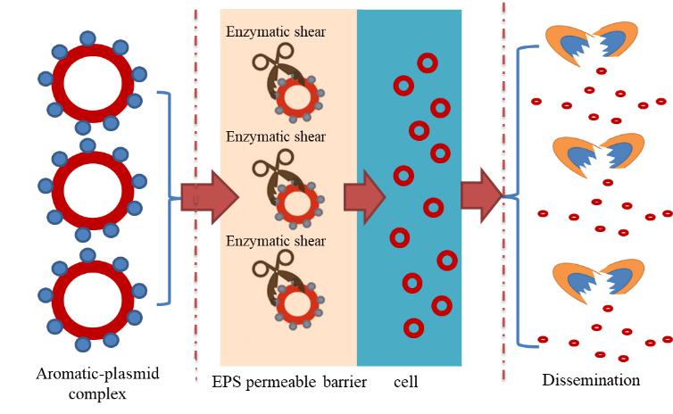 胞外聚合物质(EPS)是由微生物细胞分泌产生于胞外、由多糖、蛋白质、少量核酸等构成的一类聚合物质。它是控制“非生命-生命”关键带中污染物环境过程的重要节点,是联系“水/土壤-微生物”界面的重要界面介质,也是抗生素抗性基因赋存的汇。目前,抗生素抗性基因(ARGs)威胁全球公共健康,是人类面临的最为紧迫的环境污染风险之一。不同于传统化学品污染物,ARGs可依赖细菌宿主而自行增殖和传播,易受到多重环境介质的影响,这是导致其风险不完全可控的主因。本研究以取代性芳香族衍生物为例,研究了暴露于痕量芳香族衍生物下的游离态ARGs跨EPS界面、横向进入宿主细胞内的效率和效应,以全新的角度揭示芳香族与ARGs“狼狈为奸”,加剧基因污染风险的“帮凶”机制。