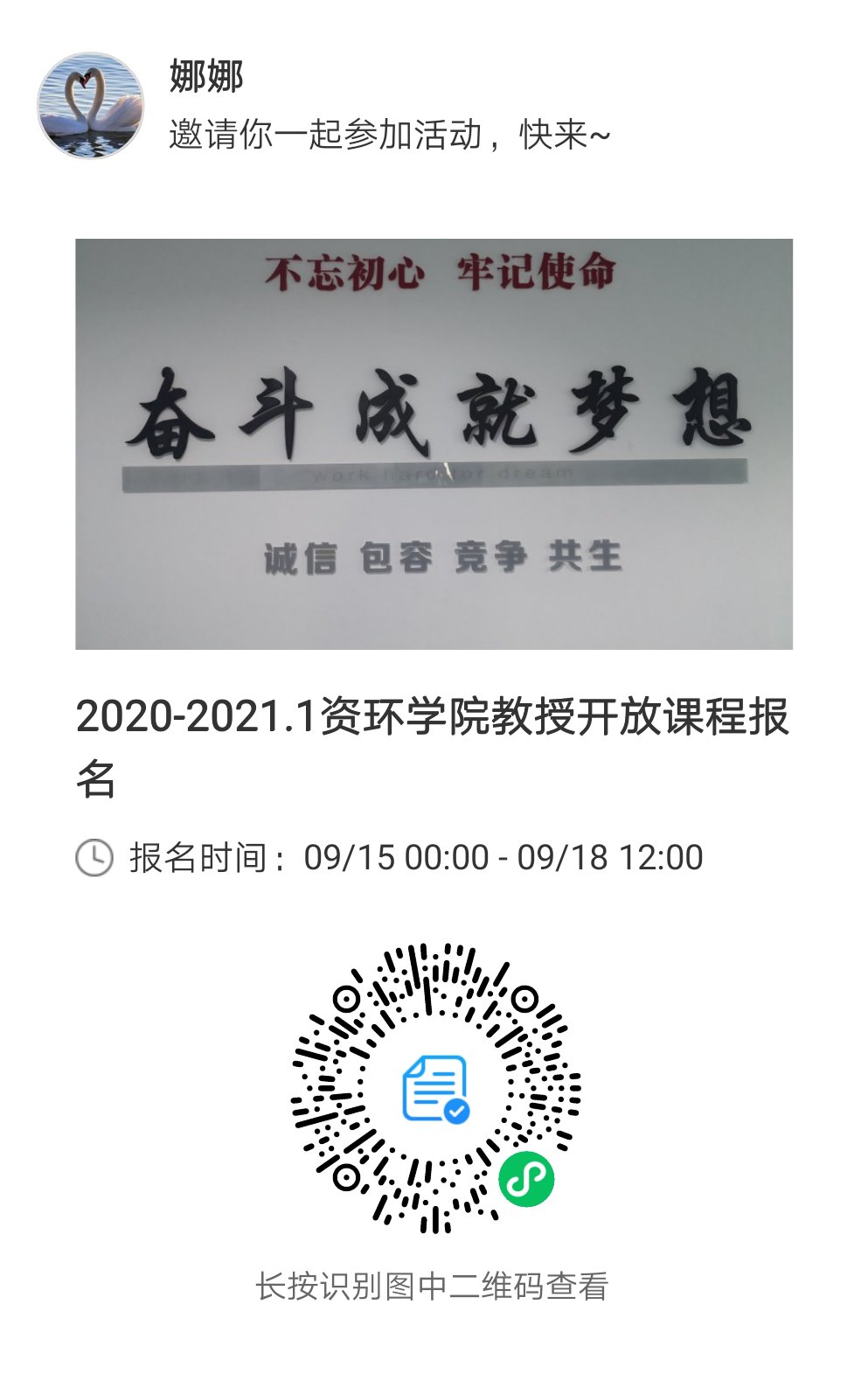 关于选修2020-2021学年第一学期“教授开放研究课程”的通知,请直接扫描小程序码报名,(选课时间:2020年9月15日-2020年9月21中午12:00),谢谢!
