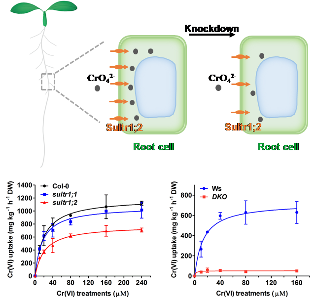 环境生物学团队采用反向遗传学的技术路线对模式植物拟南芥潜在的Cr(VI)吸收转运蛋白进行筛选,发现硫酸盐转运蛋白基因Sultr1;1和Sultr1;2的突变会显著提高拟南芥对Cr(VI)的耐性,而磷酸盐转运蛋白基因Pht1;1和Pht1;4以及钼酸盐转运蛋白基因MOT1的敲除则对拟南芥的Cr(VI)敏感性无显著影响。酵母异源表达结果表明Sultr1;1和Sultr1;2均具有Cr(VI)的转运活性,但后者的转运活性要远高于前者。进一步的Cr(VI)吸收实验发现,敲除Sultr1;1基因仅在Cr(VI)浓度较高时会稍微降低根部对Cr(VI)的吸收,而敲低Sultr1;2基因(-40%)显著降低了根部对Cr(VI)的吸收,这两个基因的双敲除突变体则几乎丧失了对Cr(VI)的吸收能力。反之,过量表达Sultr1;2基因显著提高拟南芥体内Cr的积累。这些结果表明,硫酸盐转运蛋白Sultr1;2是负责拟南芥Cr(VI)吸收的主要转运蛋白。