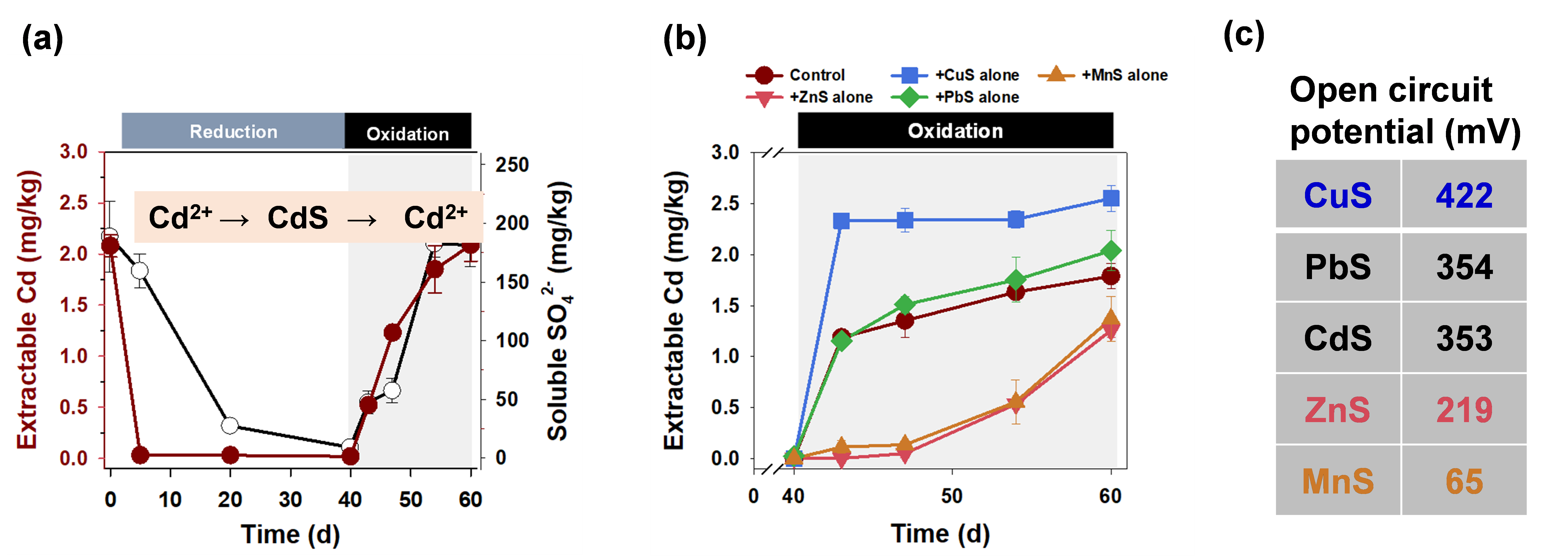 图1. 土壤淹水和氧化阶段镉有效态的动态变化(a)以及在氧化阶段不同金属硫化物对镉释放的影响(b);不同金属硫化物的电化学势(c)。