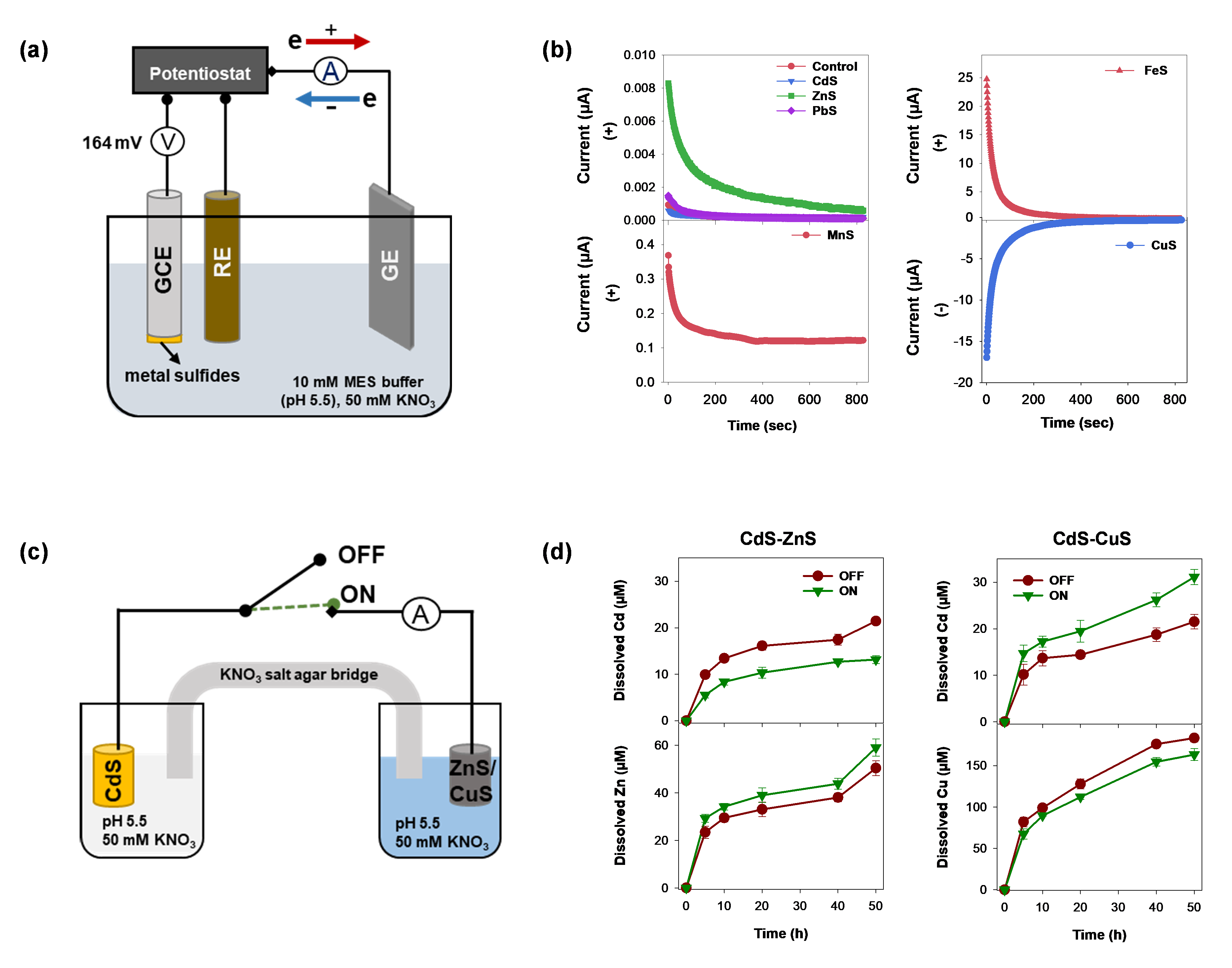 图2. 不同金属硫化物之间产生的电流以及电子传递对金属硫化物氧化溶解的影响