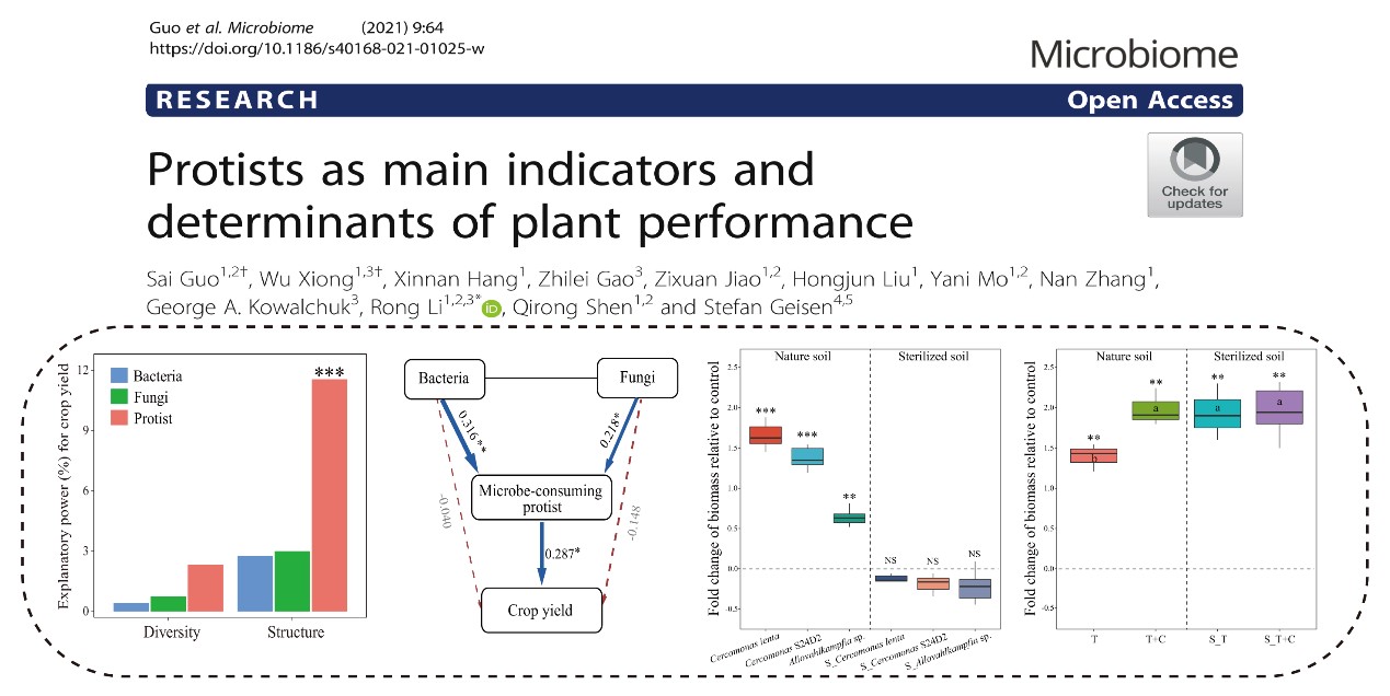“土壤微生物与有机肥团队”关于土壤原生动物影响植物生长方面的最新研究成果(Protists as main indicators and determinants of plant performance)。该成果揭示了土壤原生动物群落及其与细菌和真菌的相互协作,在促进植物生长方面的重要作用。