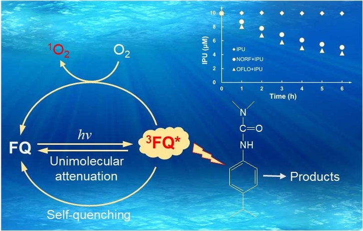 氟喹诺酮类抗生素的光化学活性源于其分子结构中的喹诺酮结构,这是一个高度共轭的苯酮结构,可有效吸收阳光中的紫外线,生成3FQ*,3FQ*进一步和水中的溶解氧反应,将其转化为1O2。3FQ*和1O2化学性质活泼,可以和多种有机污染物反应,将其转化或降解。在这项研究中,重点考察了苯脲类除草剂异丙隆(IPU)的在FQ存在下的敏化光解,其中3FQ*扮演了关键的角色。
