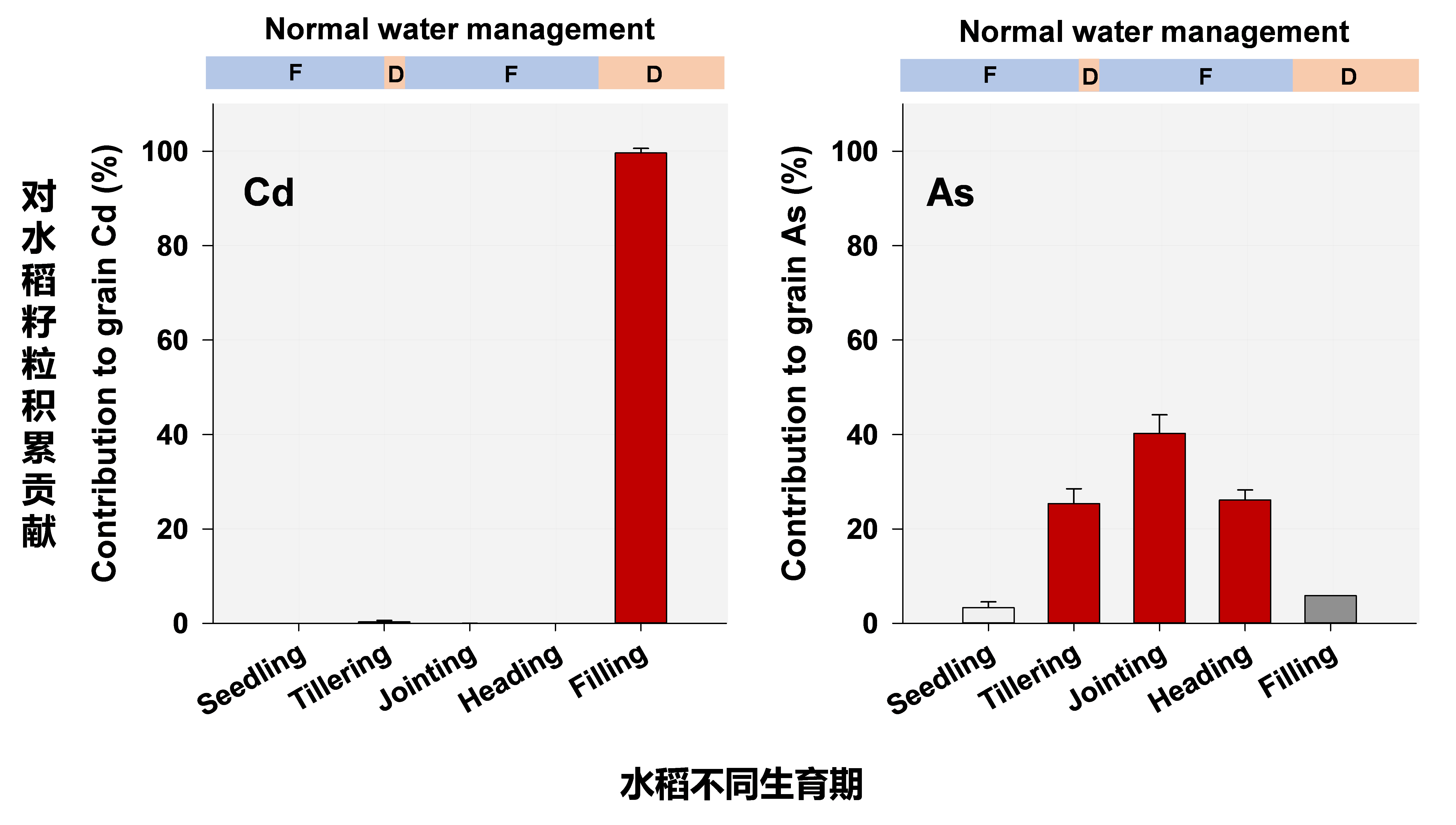 图1. 常规水分管理条件下水稻不同生育时期根系吸收对籽粒镉、砷积累的相对贡献率。F:淹水;D:排水。
