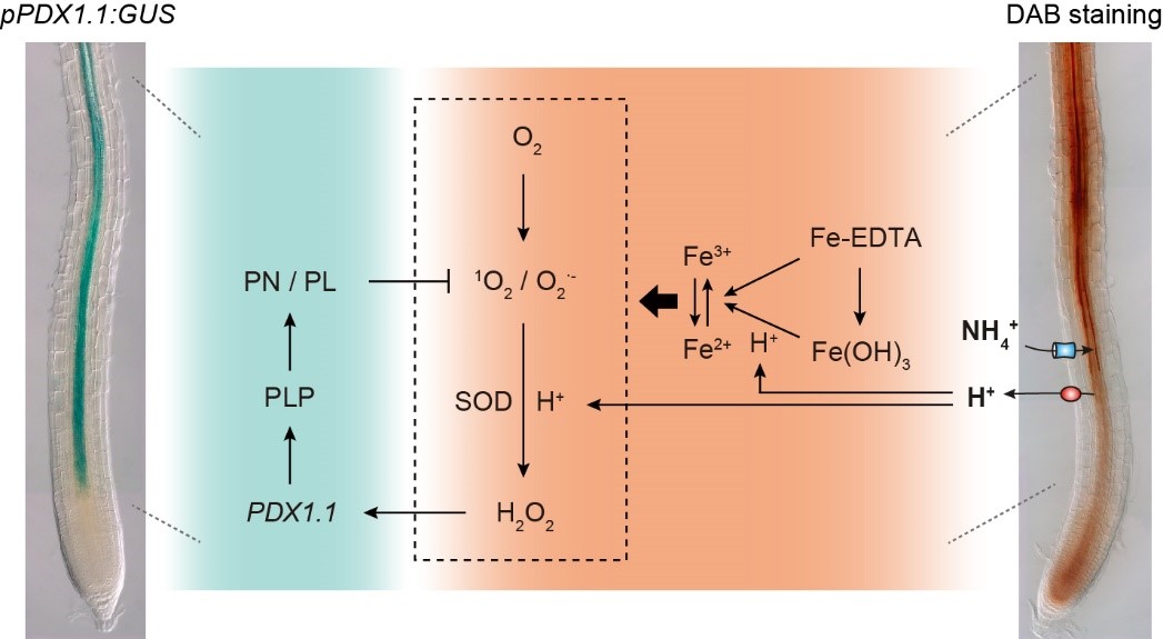 本研究同时发现,维生素B6生物合成缺陷突变体pdx1.1对铵盐呈现出过敏感的表型。在植物中,PDX1.1介导了维生素B6的生物合成。外源添加维生素B6或提高植物内源维生素B6的合成,都能够显著提高根系对铵的耐受性。非磷酸化的维生素B6,作为抗氧化物质,是植物抵抗铵毒害的关键因子。分析表明,铵诱导的活性氧可以激活植物根系PDX1.1基因的表达,并为根系提供非磷酸化的维生素B6,缓解铵引起的氧化胁迫,维持根系生长。