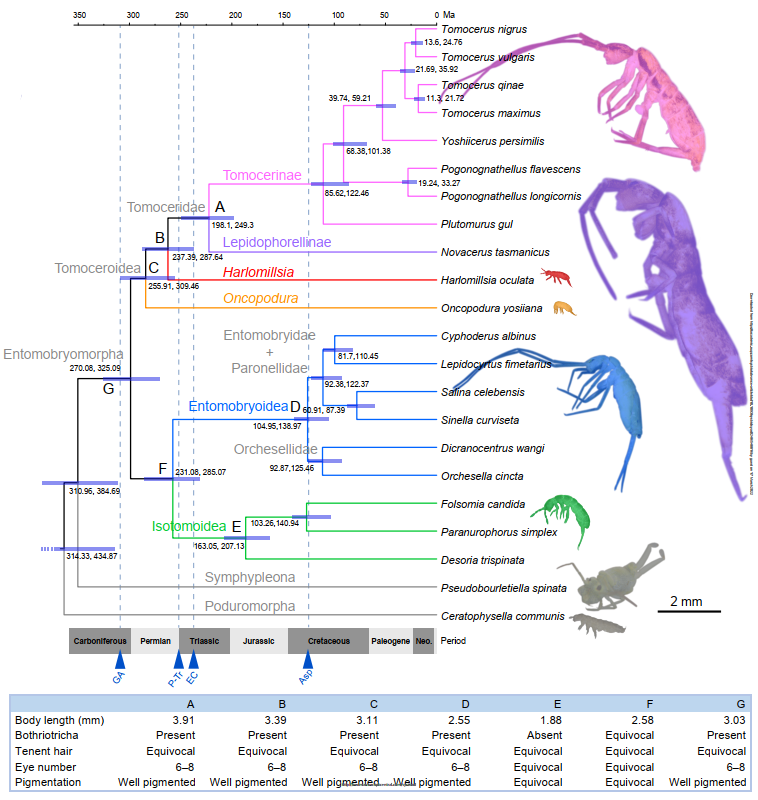 基于系统发育分析结果,本研究还进一步对长角跳目各类群的分歧时间进行了估算,并对体型、感觉器官和体色发育程度等与弹尾虫地上、地下生境选择密切相关的功能性状进行了祖先状态重建。分析结果表明,长角跳目起源于石炭纪-二叠纪,其干群应具有适应地上生活的性状组合,如较大的体型,发达的眼、色素和气流感觉器官等,这与仅有的少量化石记录基本吻合;而适应地下生活的类群是跨越古生代-中生代的多次独立生态位转换事件的结果,这些转换事件可能与二叠纪末生态系统危机、白垩纪陆地生态系统革新(被子植物分化)等事件有关,表明气候和植被变化可能对土壤生物多样性具有深远影响。