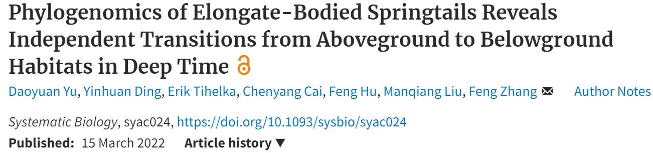 近日,国际演化生物学顶级期刊Systematic Biology在线刊登了题为“Phylogenomics of Elongate-Bodied Springtails Reveals Independent Transitions from Aboveground to Belowground Habitats in Deep-Time”的研究论文。该研究由av直播