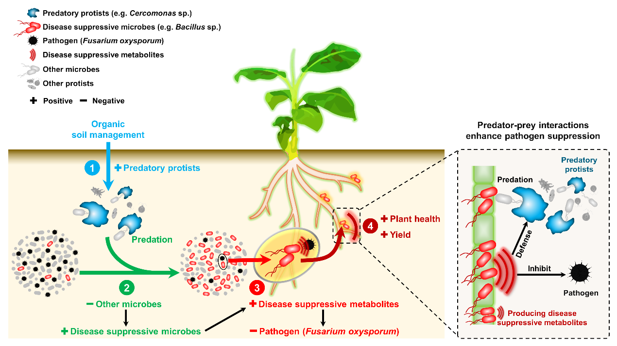 植物健康受到有益与病原微生物的强烈影响,而这些微生物会受到资源投入的调控。此外,土壤微生物又受到捕食型原生生物等捕食者自上而下的调控。然而,目前对土壤捕食型原生生物与其他微生物之间的互作抑病机制却研究甚少。本文研究了长期施用有机肥对土壤及作物根系相关微生物群落(细菌、真菌和原生生物)组成和功能的影响,旨在破译捕食者与猎物的相互作用在调控作物健康中的作用。研究发现,捕食型原生生物与细菌的互作是有机施肥模式减少枯萎病发生、提高香蕉产量的重要驱动因素。其中,捕食型原生生物的捕食行为促进了微生物组内抑病相关次生代谢物合成基因(如非核糖体肽合成酶基因)的表达,这是捕食型原生生物与功能细菌(芽孢杆菌)互作抑病的潜在机制。这一发现揭示了有机施肥模式下捕食型原生生物与细菌的互作可以通过刺激作物根系微生物群落中有益细菌的丰度和抑病功能的表达来保护作物健康。