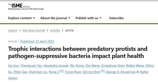 博士生郭赛和钟山青年研究员陶成圆博士为论文共同第一作者,李荣教授与沈其荣院士为通讯作者。团队熊武教授、沈宗专副教授、徐志辉副教授、硕士生王哲、博士生刘珊珊,海南大学阮云泽教授、王蓓蓓副教授,荷兰乌特勒支大学George Kowalchuk教授、Alexandre Jousset助理教授、高芷蕾博士,瓦赫宁根大学Stefan Geisen助理教授等均参与了该项研究。该研究得到国家自然科学基金等项目的资助。