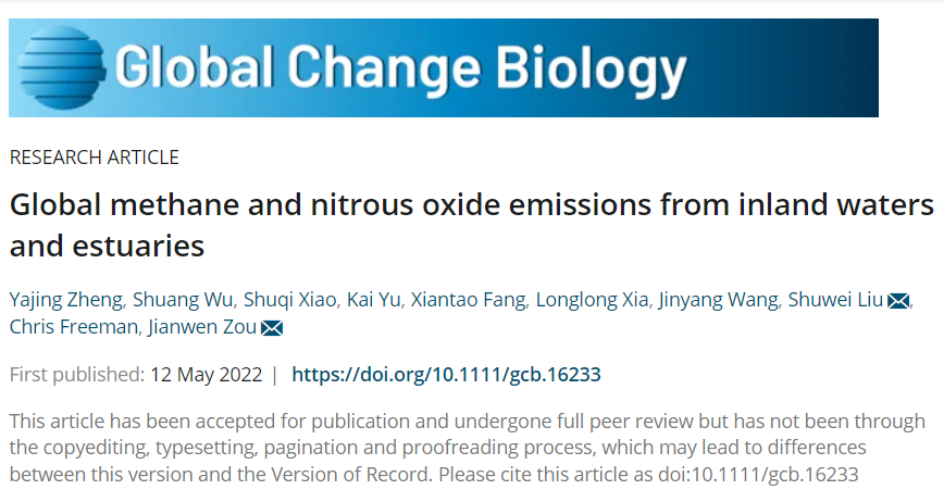 相关研究成果近日以“Global methane and nitrous oxide emissions from inland waters and estuaries”为题发表在国际全球变化研究领域权威期刊Global Change Biology上。该研究也是课题组近年来围绕流域水体温室气体排放研究在Environmental Science & Technology (2016/2019) 和Agricultural and Forest Meteorology (2021) 等刊物上发表相关结果后的又一重要进展。相关研究为了解不同排放途径(冒泡vs分子扩散)和测定方法学(箱法vs扩散模型法)差异的水体温室气体排放特征及其驱动因子提供了数据支撑,同时也为科学编制全球流域水体温室气体排放清单提供了基本参考。