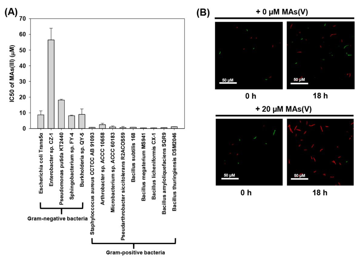 图1 (A)MAs(III)对14株不同种属细菌生长的半抑制浓度;(B)激光共聚焦照片显示添加和不添加20 µM MAs(V)对肠杆菌CZ-1(红色荧光标记)和枯草芽孢杆菌168(绿色荧光标记)共培养生长状态的影响。