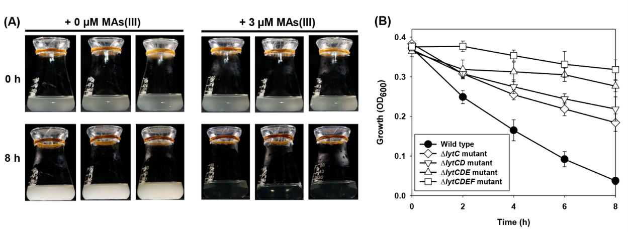 图2 (A)MAs(III)处理诱导枯草芽孢杆菌168发生自溶;(B)枯草芽孢杆菌168体内的Lyt自溶酶参与了MAs(III) 诱导的细胞自溶过程。
