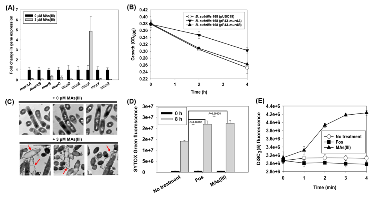 图3 (A)枯草芽孢杆菌168体内参与细胞壁肽聚糖合成相关基因的转录表达分析;(B)过表达murAA和murAB基因对MAs(III)诱导的细胞自溶的影响;(C)透射电镜照片显示MAs(III)处理对细胞形态的影响;(D)3 µM MAs(III)和1 mM磷霉素对细胞膜通透性的影响;(E)3 µM MAs(III)和1 mM磷霉素对细胞膜电势的影响。