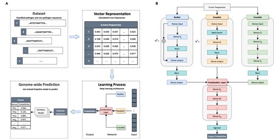 协同攻关,创建了基于交叉融合网络精准识别致病菌的深度学习算法。该研究首先收集了2.2万种致病菌和1.1万种非致病菌,构建了包括7837个属、32,927条细菌的全基因组数据集(BacRefSeq)。据统计,病原细菌的DNA序列长度在1.1 ~ 11.6 Mb之间(中位数3.8.108 bp),非病原细菌的序列长度在4.3 ~ 10.5 Mb之间(中位数3.8.108 bp)。为获得百万bp级别长序列特征,将全基因组3 ~ 7的k-mer频率词向量特征进行全组合,开发了深度交叉融合网络模型算法DCiPatho。该算法将交叉网络、残差网络和深度神经网络进行深度交叉融合,实现高阶融合特征的自动学习,大幅度降低了计算成本。虚拟实验结果表明,DCiPatho的性能超越了Bi-LSTM、CNN、Transformer、DeePaC和BERTax等9种公认的高性能深度学习算法,识别精度高达95.14%。该研究为环境土壤生物健康评估与人畜安全检测提供了新方法、新技术与新途径。