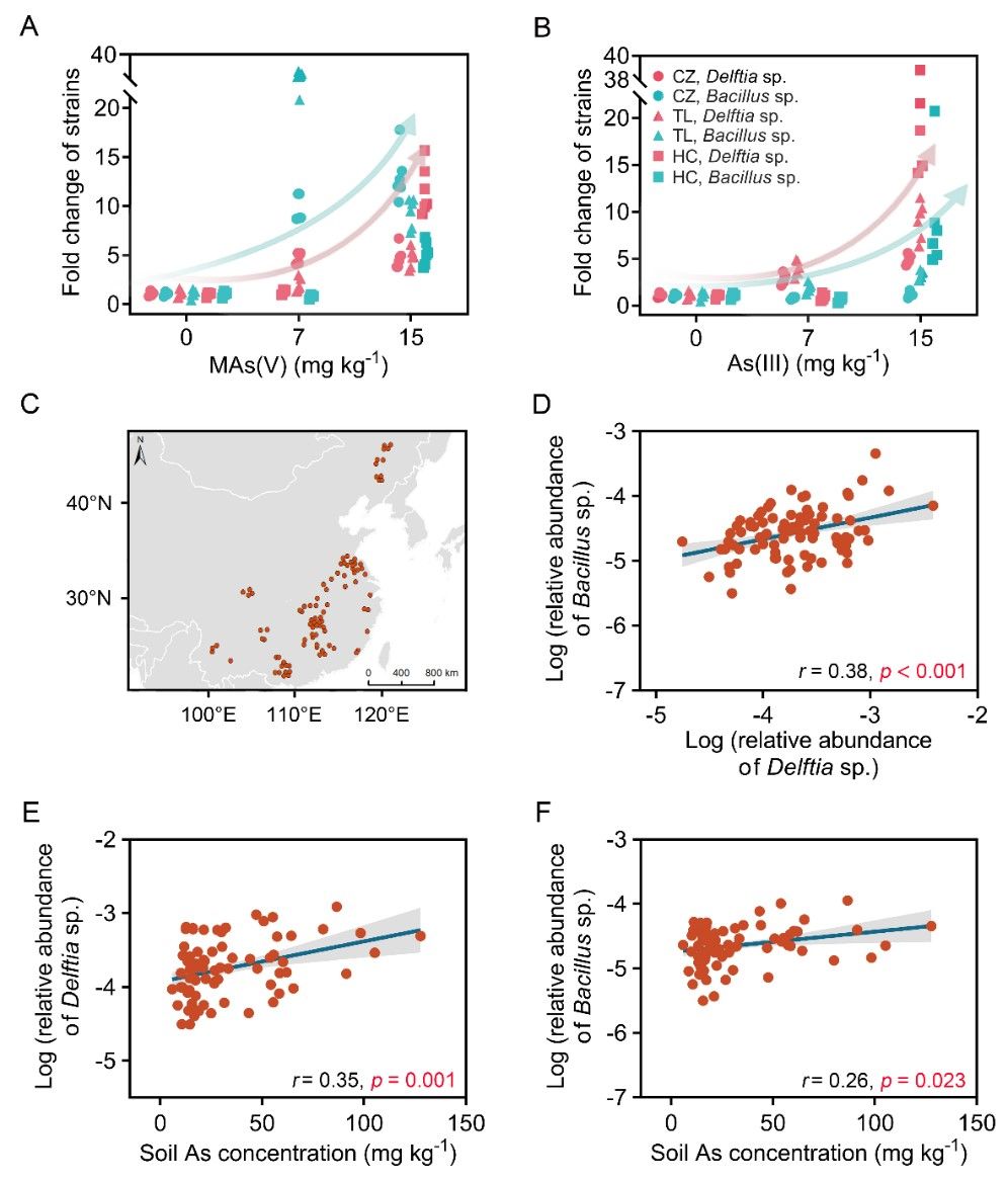 进一步研究发现,这两种细菌能够使用砷作为武器,进一步增强它们对抗其它微生物的集体竞争力(图2)。菌株Delftia sp.能将相对无毒的一甲基五价砷[MAs(V)]还原为毒性强的一甲基三价砷[MAs(III)](一种抗生素),从而杀死或抑制竞争者,而菌株Bacillus sp.能将MAs(III)甲基化为无毒的二甲基五价砷DMAs(V)来解毒,从而不受MAs(III)的抑制作用。当菌株Delftia sp.和Bacillus sp.一起生长时,这两种砷的转化过程会得到增强。Delftia sp.和Bacillus sp.在砷转化方面的交互作用提高了它们相对于其他菌株的集体竞争力(第二重互惠)。进一步通过全国103份不同砷含量土壤的微生物16S rRNA数据分析,发现Delftia sp.和Bacillus sp.及其近亲细菌广泛共存于土壤中,并且它们的丰度随着土壤砷浓度的升高而增加,说明这类双重互惠在土壤微生物群落中是常见现象。