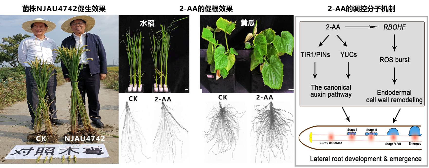 了沈其荣院士团队张瑞福教授课题组的最新研究成果“Trichoderma-secreted anthranilic acid promotes lateral root development via auxin signaling and RBOHF-induced endodermal cell wall remodeling”。该研究基于生物肥料生产中广泛应用的木霉菌Trichoderma guizhouense NJAU4742具有显著的植物促生作用、而其生长素合成突变株仍具有显著的促根发育活性这一现象,推测该木霉菌株分泌其他未知的促根活性代谢物。采用生物活性导向的分离技术从菌株NJAU4742生长素合成突变株中分离纯化到一个小分子化合物邻氨基苯甲酸(2-AA),2-AA能促进多种粮食和经济作物的根系发育,具有广谱性。分子调控机制研究揭示了2-AA一方面与植物生长素信号传导和运输网络互作,促进侧根的形成。另一方面,2-AA可以通过RBOHF介导的ROS爆发调节植物内皮层细胞壁重构,促进侧根萌发。该研究为利用根际益生菌开发促根制剂、迭代升级微生物肥料产品提供了科技支撑。