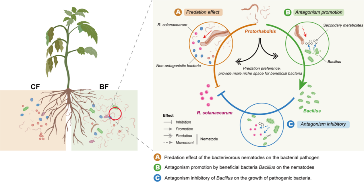 近日,沈其荣院士团队李荣课题组在生物有机肥调控土壤微食物网促进作物健康机理研究方面取得重要进展,成果以《Protorhabditis nematodes and pathogen-antagonistic bacteria interactively promote plant health》为题发表于国际学术期刊《Microbiome》。该研究深入解析了施用生物有机肥诱导的健康土壤食物网特征,揭示了土壤动物(食细菌线虫)通过调控植物根际微生物群落组装发挥抑制青枯病病原菌功能的作用机理,并阐明了食细菌线虫与拮抗性细菌间协同抑制土传病害的具体机制。