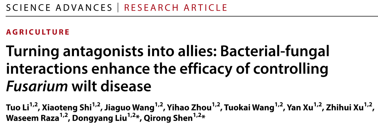 沈其荣院士课题组在《Science Advances》杂志上发表题为“Turning antagonists into allies: Bacterial-fungal interactions enhance the efficacy of controlling Fusarium wilt disease”的论文,该研究阐明了细菌与真菌从拮抗到共存的互作模式转变对防控番茄枯萎病的重要作用机制。