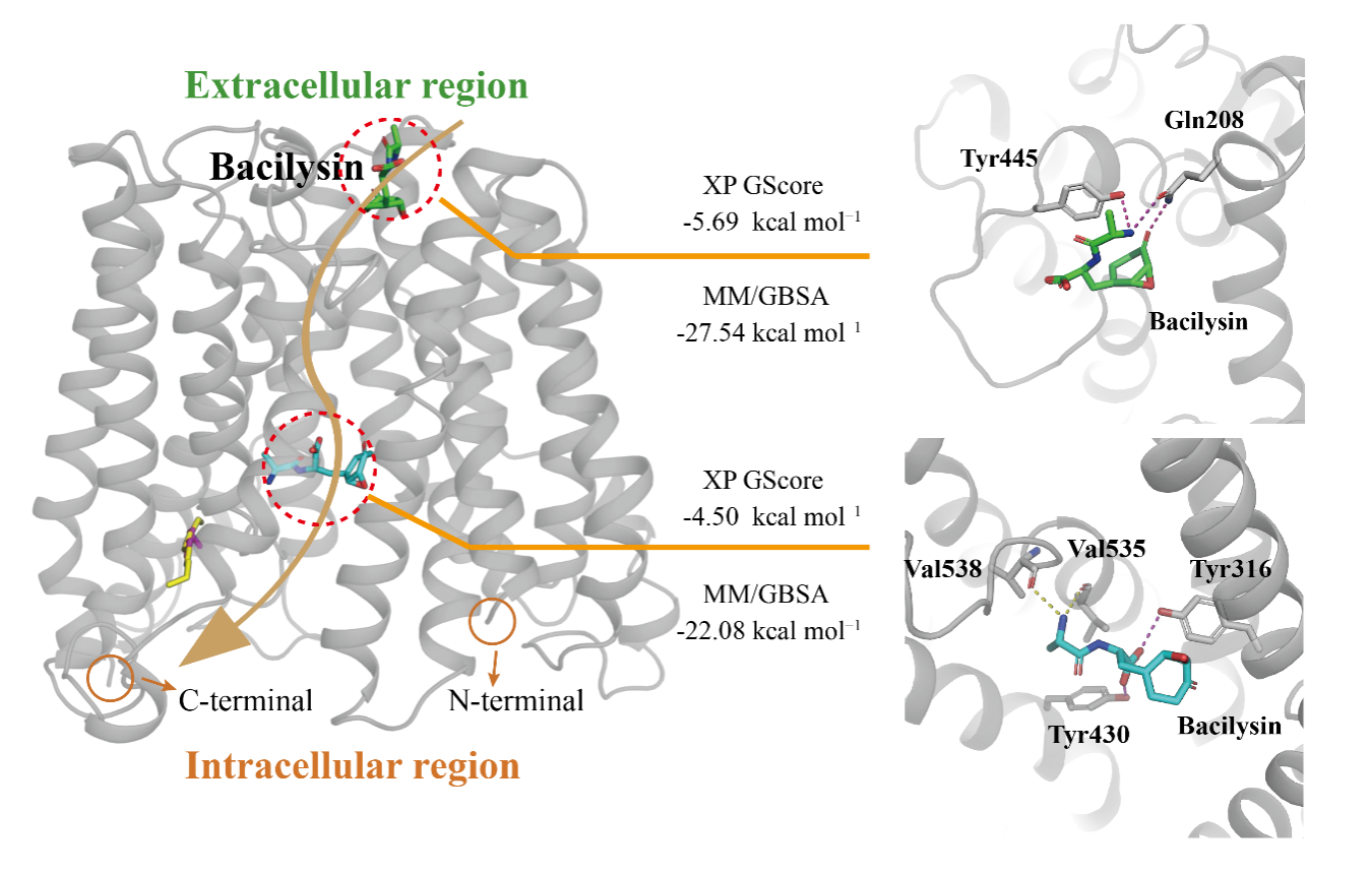 为了探究这种跨界相互作用转变的分子生物学机制,研究人员利用共培养转录组学测序、基因编辑、分子对接等多项技术,发现了Tg中存在一个关键的bacilysin转运蛋白(TgMFS4),它在Bv与Tg的跨界对话中起着至关重要的作用。敲除Tgmfs4基因显著减轻了Bv与Tg之间的拮抗作用,减少了bacilysin进入Tg细胞的量(降低bacilysin对于Tg的细胞损害),并提高了共培养环境中bacilysin的水平。这种增加的bacilysin水平作为一种负反馈调节因子,限制其在Bv中的过度生产,节省了能量成本并转化为Bv的生物量增长。