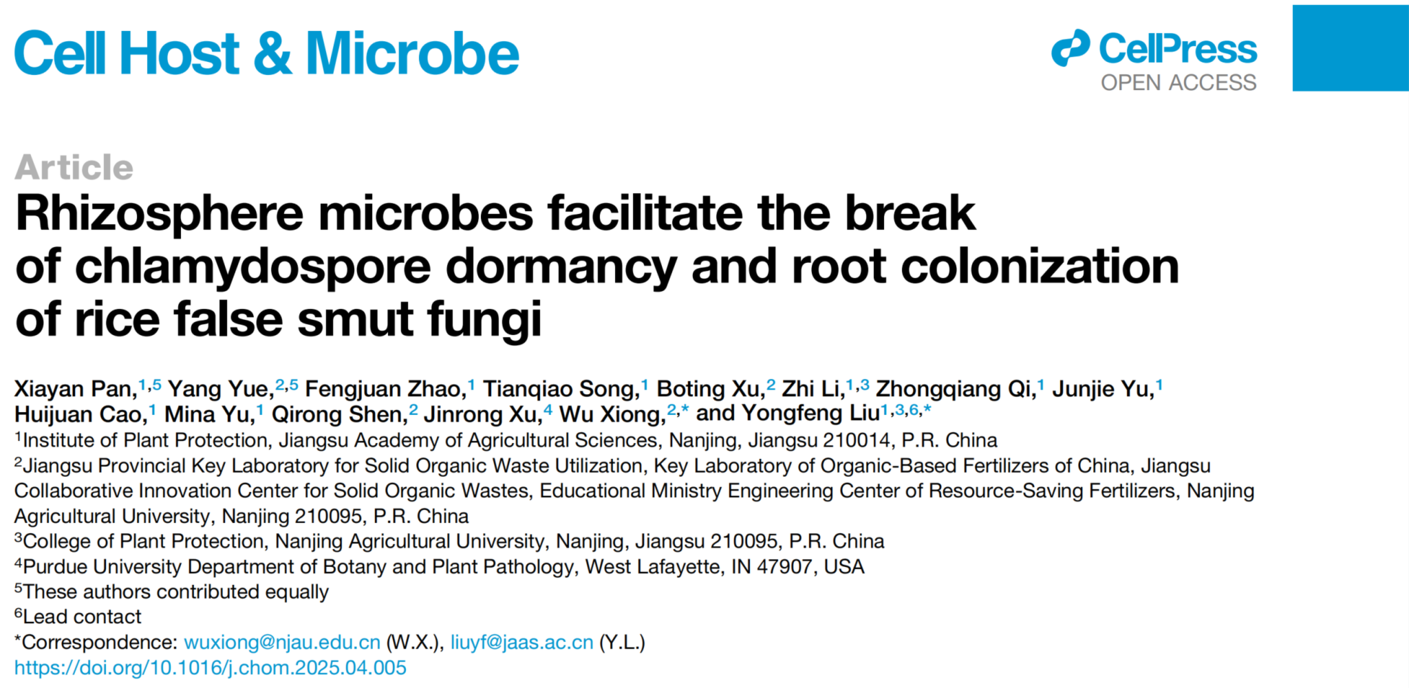 刘永锋研究员团队合作,在国际权威期刊《Cell Host & Microbe》发表题为“Rhizosphere microbes facilitate the break of chlamydospore dormancy and root colonization of rice false smut fungi”的研究论文。该论文系统性阐明了根际微生物调控稻曲病菌厚垣孢子打破休眠萌发并在水稻根部定殖机制,揭示了长期困扰行业领域内的“侵染源之谜”,证实了土壤中越冬后的厚垣孢子是稻曲病重要初侵染来源,为水稻抗病种质资源挖掘和病害的绿色防控提供了重要理论依据。