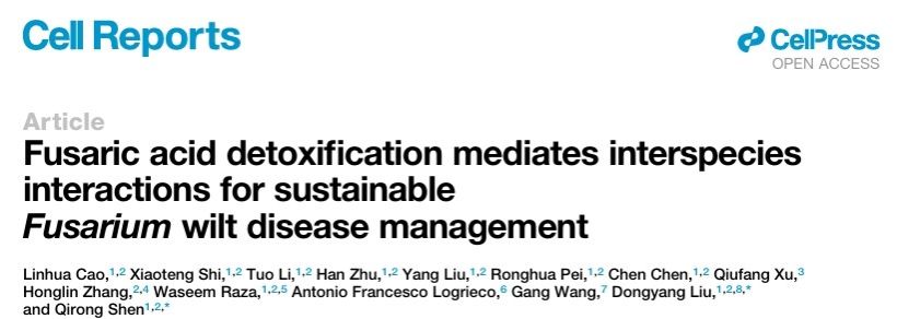 沈其荣院士团队在《Cell Reports》杂志上发表题为“Fusaric acid detoxification mediates interspecies interactions for sustainable Fusarium wilt disease management”的研究论文。该研究揭示了哈茨木霉(Trichoderma harzianumNJAU4742)通过脱毒镰刀菌毒素镰刀菌酸(Fusaric acid, FSA),从而构建根际生态互作网络并有效防控镰刀菌枯萎病的重要机制。