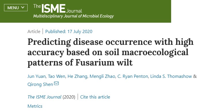沈其荣教授课题组通过对全球1500多个土壤测序样品的整合分析,在枯萎病土壤微生物特征解析及发病预测方面取得重要进展。研究结果以“Predicting disease occurrence with high accuracy based on soil macroecological patterns of Fusarium wilt”为题发表在国际微生物领域顶级期刊《The ISME Jounal》上。课题组袁军博士和博士生文涛为论文共同第一作者,沈其荣教授为通讯作者,美国亚利桑那州立大学的C Ryan Penton和美国农业部的Linda Thomashow参与了该项研究。