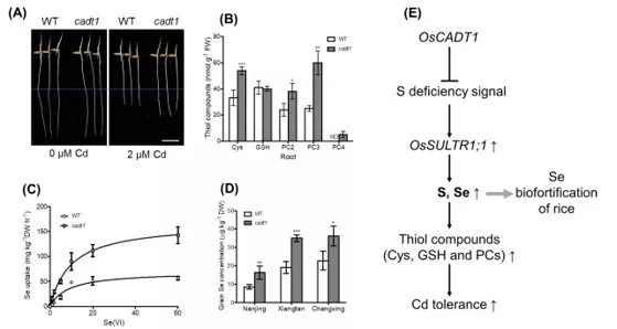 图1.水稻OsCADT1突变导致硫/硒吸收及植物螯合肽合成增加,具有富硒耐镉的作用